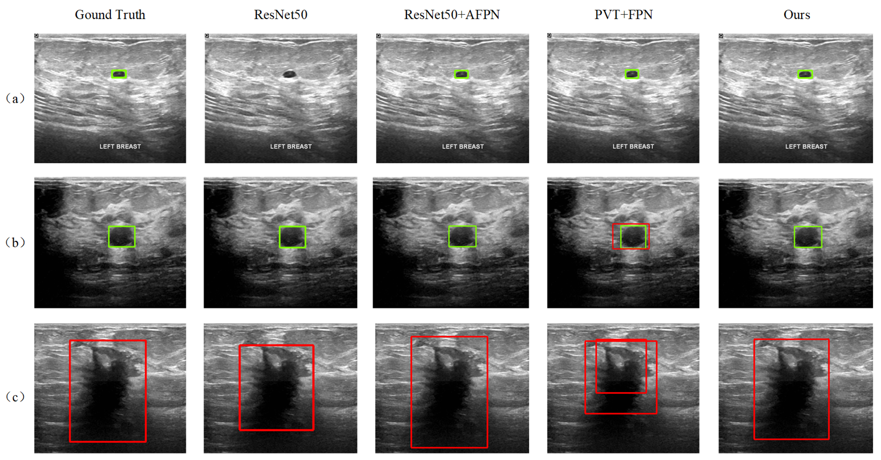 Figure 8 shows the results of some sample images, where samples (a) and (b) contain benign tumors with large-scale differences, marked by the green boxes, while sample (c) contains a malignant tumor, marked by the red boxes. The detection results of the three reference models, ResNet50, ResNet50+AFPN, and PVT+FPN, that performed better in