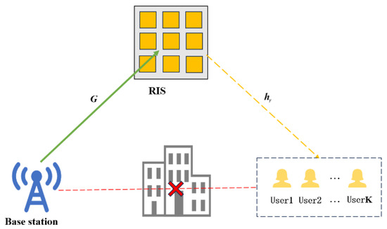 We consider a downlink communication system assisted by one RIS. As shown in Figure 1, the system consists of a single-antenna signal transmitting base station (BS), multiple single-antenna users, and an RIS with N reflective elements. Due to obstacles blocking the communication link between the BS and users, the RIS is utilized to assist communication, forming a BS-RIS-user link. Consequently, the signal received by the k-th user from the BS is expressed as follows: