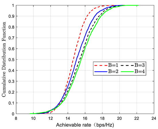 The number of bits for discrete phase shifts directly affects the accuracy of phase selection and plays a crucial role in optimizing system performance. A higher number of bits allows the RIS to realize more phase shift levels with greater precision, thereby improving the quality of the reflected signal. Figure 2 illustrates the cumulative distribution of system transmission rates under different phase shift bit levels. Simulation results show that a higher number of bits leads to better system throughput, as more precise phase control facilitates coherent signal combining, which significantly enhances the overall data rate. However, increasing the number of bits also introduces higher hardware complexity, energy consumption, and implementation cost. Therefore, a trade-off between performance and cost must be considered in practical system design. High-rate and high-precision communication scenarios—such as 5G millimeter-wave and future 6G systems—benefit from higher bit resolutions, while cost-sensitive applications may opt for lower bit levels to achieve a more balanced solution.