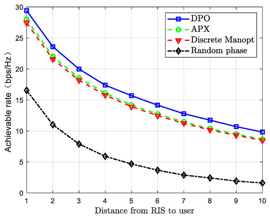 As observed in Figure 3, in RIS-assisted wireless communication systems, the system’s information transmission rate shows a significant decreasing trend as the distance between the RIS and the end user increases. This phenomenon is primarily due to path loss effects during electromagnetic wave propagation. As the distance grows, the reflected link experiences greater spatial attenuation. Specifically, when the RIS is positioned closer to the user, the reflection path loss is relatively low, enabling the RIS to effectively enhance signal beamforming and improve the system’s transmission rate. However, as the distance increases, the reflection path loss grows exponentially, causing a sharp decline in the received signal energy. In practical deployments, it is essential to optimize the RIS position in three-dimensional space to strike a balance between coverage area and reflection efficiency. The performance of the proposed DPO algorithm is compared against three competitive benchmarks: APX [16], Manopt [17], and random phase shifts. As observed, the DPO algorithm consistently achieves a higher achievable rate. The performance gap with the Manopt method can be attributed to its inherent difficulty in directly handling discrete optimization variables, leading to performance loss during the projection step. While APX is effective, it is not specifically tailored for the joint problem of discrete phase shift and user scheduling, which is the core focus of our DPO algorithm. This result underscores the advantage of our tailored approach in solving this specific high-dimensional combinatorial problem.