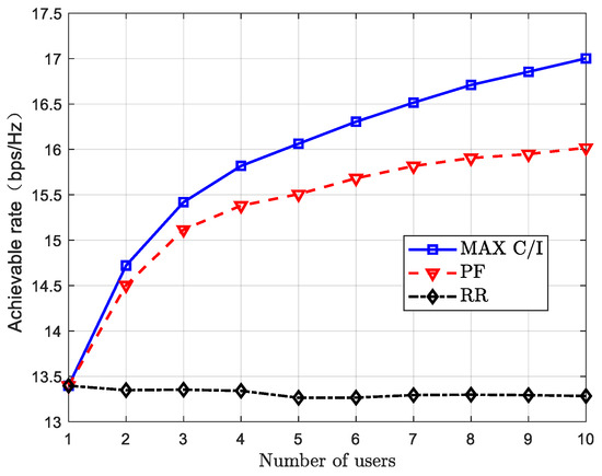 Figure 4 presents a performance comparison of three classic user scheduling algorithms: Round-Robin (RR), Proportional Fair (PF), and MAX C/I. These algorithms represent different trade-offs between fairness and performance. The RR algorithm allocates resources to each user in a fixed order, ensuring absolute fairness, but it does not consider channel conditions, resulting in lower overall system performance. The PF algorithm seeks a balance between user throughput and channel quality, making it a compromise between fairness and efficiency. In contrast, the MAX C/I algorithm fully prioritizes system performance by always selecting the user with the best channel conditions.