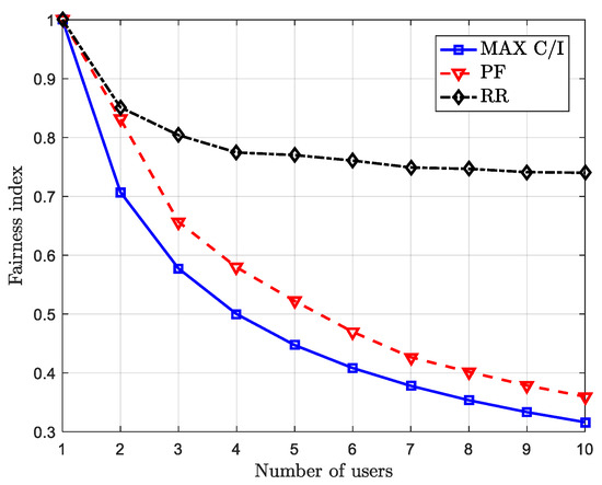 Figure 5 compares the performance of three classic resource allocation algorithms (MAX C/I, RR, and PF) in multi-user scenarios based on the Jain fairness index [18]. The Jain index measures the fairness of resource allocation. While MAX C/I maximizes system capacity, it tends to allocate resources to a few users, resulting in poor fairness. The RR algorithm allocates resources in a fixed order, offering better fairness but ignoring channel conditions, which can lead to inefficient resource utilization. The PF algorithm dynamically balances instantaneous channel quality and historical resource usage, achieving a trade-off between throughput and fairness. From a practical perspective, MAX C/I is suitable for bursty traffic scenarios that prioritize capacity, RR is better suited for static and low-power IoT systems, while PF performs well in mobile communication scenarios with rapid channel variations. In summary, the choice of resource allocation strategy should align with specific system goals and scenario characteristics to balance performance and fairness effectively.