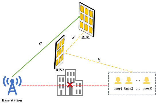 In a single-RIS-assisted multi-user scheduling system, if the base station and users are located on opposite sides of the RIS, the RIS may not be able to effectively cover all communication paths. To overcome this limitation, a double-RIS-assisted communication system is further investigated, as illustrated in Figure 7. This system consists of one base station, two reconfigurable intelligent surfaces (RIS1 and RIS2) with N1 and N2 reflecting elements, respectively, and K users. In this setup, the BS and the users are located on opposite sides of RIS1, while both RIS1 and the users are on the same side of RIS2. Therefore, the signal transmitted from the BS firstly reaches RIS1, is reflected to RIS2, and then reflected again to the intended users. All other communication paths are assumed to be blocked. Therefore, the signal received by the user from the BS can be expressed as: