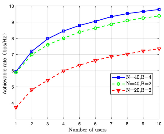 Figure 8 presents the performance comparison of the double-RIS system under different configurations. The comparison parameters include the number of reflecting elements and the number of discrete phase shift bits. As shown in the figure, with the same number of users, a larger number of reflecting elements, and higher quantization precision can significantly improve signal manipulation capability and system capacity. Moreover, as the number of users increases, the system can better utilize spatial resources through multi-user scheduling strategies, thereby improving the overall transmission rate. In summary, increasing the number of reflecting elements and the phase shift resolution is an effective way to enhance the communication performance of double-RIS systems. Compared to single-RIS systems, although performance may degrade due to path loss between the two RISs and the absence of additional reflected paths, the double-RIS architecture solves the coverage limitations of reflected signals for users.