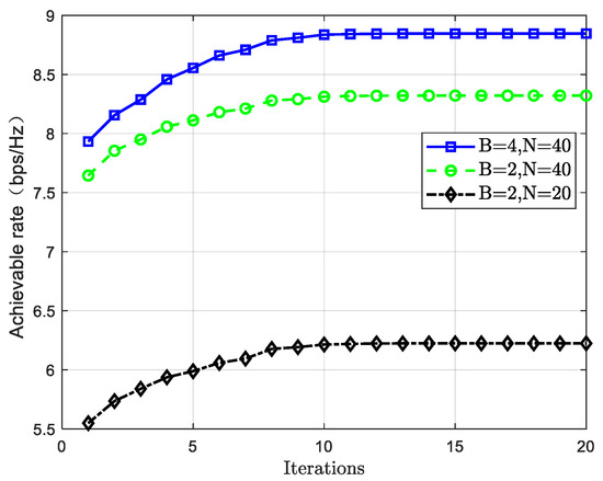 Figure 9 illustrates the convergence performance of the double-RIS system under different configurations. The horizontal axis represents the number of iterations, while the vertical axis shows the achievable rate, used to evaluate the system’s convergence speed and final performance under various settings of reflecting elements and discrete phase shift bit levels. As shown in the figure, all configurations exhibit good convergence behavior: the achievable rate increases with the number of iterations and gradually stabilizes. Therefore, with proper configurations, the double-RIS system can not only achieve a high achievable rate but also converge rapidly within a limited number of iterations, demonstrating strong practicality and computational efficiency.