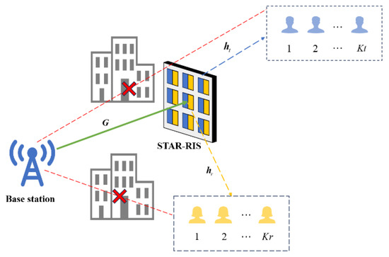 As shown in Figure 10, we consider a downlink communication system assisted by a STAR-RIS. The system consists of a signal transmission base station with a single antenna, users in the transmission area, users in the reflection area, and a STAR-RIS consisting of N elements. In this section, the direct links from the base station to the reflection area and transmission area are blocked, so the signals received by the users are only those that have been transmitted or reflected by the STAR-RIS. Therefore, the signals received by the user in the transmission area and the user the reflection area are denoted as follows: