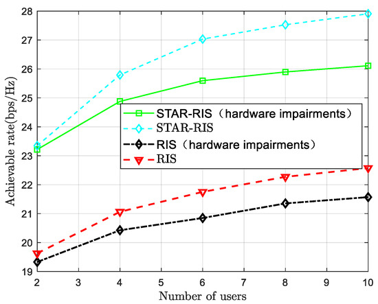 Figure 11 illustrates the relationship between the number of users and the achievable data rate. As shown in the figure, the data rate increases with the number of users across all RIS configurations, with a particularly significant improvement observed in the STAR-RIS system. Compared to conventional RIS systems, the STAR-RIS system can allocate resources more efficiently in multi-user environments. Not only does STAR-RIS offer broader coverage angles than traditional RIS, but it also enhances signal transmission quality and optimizes spectrum utilization by adjusting the amplitude of its transmission and reflection coefficients. This enables it to support more users and achieve higher data rates than conventional RIS systems. In addition, a comparison scenario considering hardware impairment [19] caused by discrete phase shifts—modeled as random phase errors—is included. The results indicate that such hardware impairments have a certain impact on system performance.