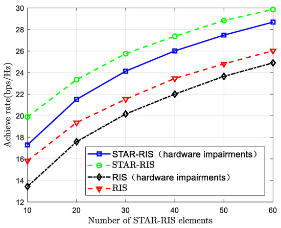 Figure 12 shows the relationship between the number of elements and the achievable data rate. It can be observed from the figure that as the number of elements increases, the data rate significantly improves under all configurations. A larger number of elements provides more transmission paths for the system, which is particularly beneficial in practical environments where interference and signal attenuation are prevalent. The increased number of elements allows STAR-RIS to enhance multipath propagation by adjusting both the amplitude and phase of the transmission and reflection coefficients. The performance gain of STAR-RIS over conventional RIS mainly lies in its ability to control signal amplitude. In conventional RIS, the reflective surface typically only controls the phase of the signal while the amplitude remains constant. In contrast, STAR-RIS not only adjusts the phase but also dynamically controls the amplitude. This joint control of amplitude and phase allows STAR-RIS to more precisely optimize signal transmission paths. Similarly, when hardware impairments caused by discrete phase shifts are considered, the overall system performance declines.