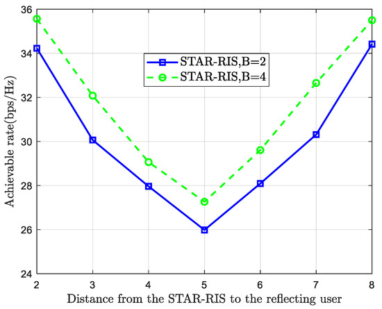 Figure 13 illustrates the impact of user location distribution on the performance of a STAR-RIS-assisted communication system. By adjusting the positions of the reflecting and transmitting users relative to the STAR-RIS, while keeping the sum of their distances constant at 10 m (i.e., , where and denote the distances from the STAR-RIS to the transmitting and reflecting users, respectively)—it is observed that an asymmetric user distribution (i.e., one user being closer to the STAR-RIS while the other is farther away) can enhance the system sum rate. This phenomenon stems from the system’s dynamic resource allocation mechanism during optimization. When a user is located closer to the STAR-RIS, the corresponding channel strength is enhanced due to lower path loss, leading the system to allocate more resources to the near-end user. However, while this asymmetric allocation strategy can improve the overall sum rate, it does so at the expense of the performance of the far-end user. When the users are symmetrically positioned (i.e., ), the sum rate reaches its minimum, as shown in the curve. This is because the channel gains for both the transmitting and reflecting users become balanced under symmetric distribution, preventing the resource allocation strategy from effectively leveraging the advantage of a stronger channel for either user.