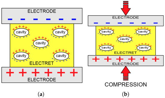 The effect of compression in two situations: (a) the piezoelectret is in its uncompressed state, (b) the piezoelectret is under compression.