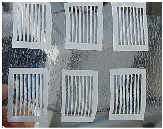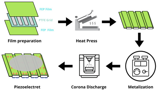The fabrication of the piezoelectret sensors involved a sequence of mechanical, thermal, and electrical processes to obtain flexible structures with internal cavities capable of charge retention. The process began with the laser cutting of two FEP sheets (50 µm thick) and a PTFE spacer grid (100 µm thick) into 30 mm × 40 mm rectangles. The PTFE layer, patterned with a 1.5 mm pitch, defined the cavity locations. This grid was sandwiched between the FEP films and pressed at 290 °C for 10 s using a Kapton-covered thermal laminator. The steps involved in this thermoforming process are illustrated in Figure 3.