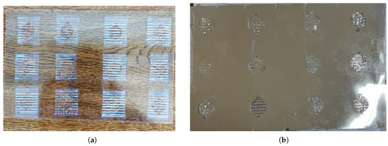 After cooling, the PTFE layer was removed, leaving air cavities between the FEP layers. The films were then metalized using a sputtering process with aluminum, applied through a mask to define circular electrode areas on both sides of the structure. Figure 5a shows the acetate masks used during sputtering, and Figure 5b displays the localized aluminum deposition on the active region.