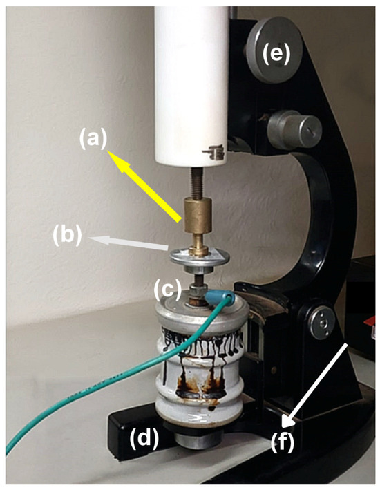 The electrets were charged using a 3 kV high-voltage source applied for 60 s at 25 °C, with brass and aluminum electrodes separated by ceramic insulators to ensure field concentration and safety. This method ionizes the air within the cavities, leading to stable charge trapping. The charging setup used in this stage is presented in Figure 6, which includes an adjustable top terminal and insulated base for safe operation. where (a) is the brass contact, with the positive terminal (+), (b) the electret, (c) is the aluminum negative terminal (−), (d) is the isolated ceramic base, (e) is the wheel to adjust the height of the brass contact, and (f) is the 3 kV module.