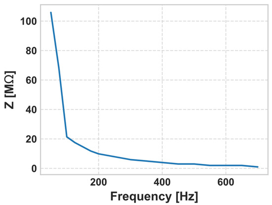 Figure 8 shows the impedance of the electret measured with an Agilent E4980A LCR (Keysight, Santa Rosa, CA, USA) meter. The impedance analysis of the piezoelectret reveals a predominantly capacitive behavior, characterized by a strong inverse relationship between impedance (Z) and frequency (f). At low frequencies, specifically around 50 Hz, the device exhibits a very high impedance, exceeding 100 MΩ, indicating a strong opposition to alternating current flow. As the frequency increases, the impedance drops sharply, following the theoretical relationship for capacitive reactance, . This behavior is consistent with an electrical model composed of a capacitor C in parallel with a large resistor R. At low frequencies, the high reactance of the capacitor causes the overall impedance to be dominated by the large parallel resistance. Conversely, at higher frequencies, the decreasing capacitive reactance provides an easier path for the current, leading to the significant drop in total impedance observed in the graph.