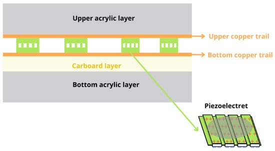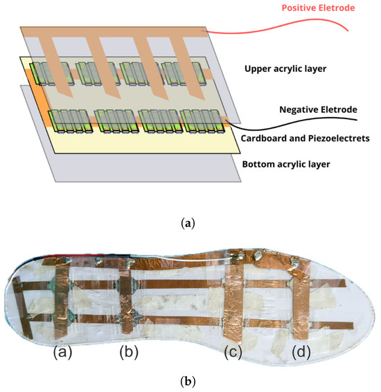 To implement the energy harvesting system in a wearable format, a custom insole was developed to house the piezoelectret sensors. The insole was designed with a multilayer structure, consisting of two outer acrylic sheets (1 mm thick) and an internal rigid cardboard layer (1 mm thick) that served as both a mechanical support and cable routing plane.