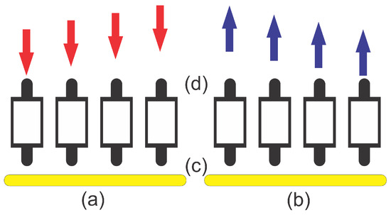 Figure 13 shows the schematic of the solenoid-driven test rig used to simulate human gait. (a) Pistons in the force-application state (red arrows), mimicking the stance phase when the foot presses the insole. (b) Pistons in the released state (blue arrows), corresponding to the swing phase when the foot is lifted. (c) Yellow bar represents the instrumented insole. (d) Rectangular blocks represent the solenoid pistons. This configuration reproduces the sequential heel-to-toe compression pattern of human walking in a controlled and repeatable laboratory setup.