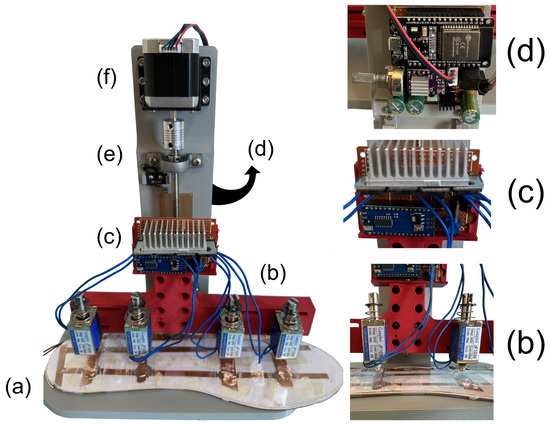 Experimental test rig developed for controlled gait simulation. (a) Instrumented insole with piezoelectret sensors mounted on the test bench. (b) Bridge with four linear solenoid pistons (JF1039, 25 N each) for localized compression. (c) Custom MOSFET driver stage with heatsink and ATmega328PB microcontroller for solenoid activation. (d) ESP32-based control unit with potentiometers for fine-tuning operational parameters. (e) Guided spindle-lifter mechanism ensuring vertical alignment of the pistons. (f) Stepper motor driving the lead screw to maintain platform positioning and provide stable support during testing.