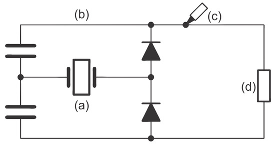 The piezoelectret sensors embedded in the insole generate alternating voltage signals (AC) in response to mechanical compression during the simulated gait cycle. To convert these signals into a usable direct current (DC) output for potential energy harvesting applications, a passive rectification circuit was implemented. The selected topology was a Delon voltage doubler circuit, also known as a peak detector, composed of two 1N5408 diodes and two 1 nF ceramic capacitors. In theory, this configuration can both rectify and double the peak voltage of an AC signal. However, due to the specific electrical characteristics of the piezoelectret source such as high internal impedance, low output current, and low-frequency content, the circuit behaved primarily as a half-wave rectifier, failing to achieve effective voltage doubling under dynamic load conditions. This behavior is consistent with the limited charge transfer observed during the negative half-cycle, which was insufficient to fully charge the second capacitor. Despite this, the use of the Delon topology was motivated by several practical considerations. Its simplicity and low component count make it a cost-effective and compact solution for low-power systems. Additionally, it is well-suited for signals with low amplitude and high impedance, where more complex active converters (e.g., buck or boost regulators) would be inefficient or unnecessarily complex. Most importantly, the goal of this setup was not to maximize harvested energy, but rather to characterize the electrical behavior of the piezoelectret sensor under dynamic mechanical loading. In this context, the Delon circuit still provided a stable and filtered DC output, enabling reliable oscilloscope measurements of waveform shape, peak amplitude, and average voltage. [42,43,44,45]. Figure 15 illustrates the implemented circuit, where (a) represents the insole acting as an AC voltage source, (b) the connecting wires, and the two diodes perform the rectification stage. The capacitors alternate charge storage over each half-cycle. The output voltage was measured at point (c) using an oscilloscope, while (d) a load resistor of 10 k was selected as a representative value commonly used in energy-harvesting characterization studies. This resistance provides a current draw in the hundreds of microamperes for voltages in the range of 1–3 V, consistent with the consumption levels of ultra-low-power wearable devices and sensor front-ends. Moreover, it represents a practical compromise: sufficiently low to emulate a realistic load, yet high enough to avoid excessive damping of the piezoelectret output during testing. In summary, although the Delon circuit did not perform as a voltage doubler in this specific case, it still offered effective signal rectification and filtering, meeting the experimental requirements for sensor evaluation in a simple and efficient manner.