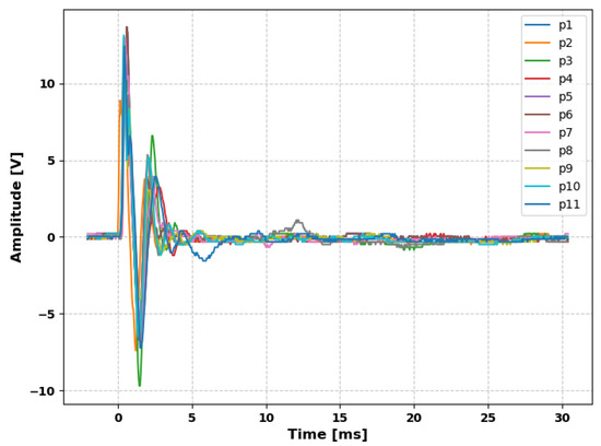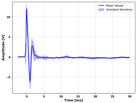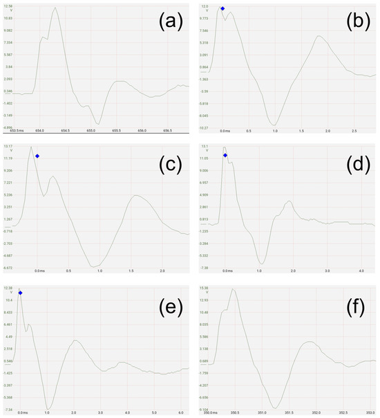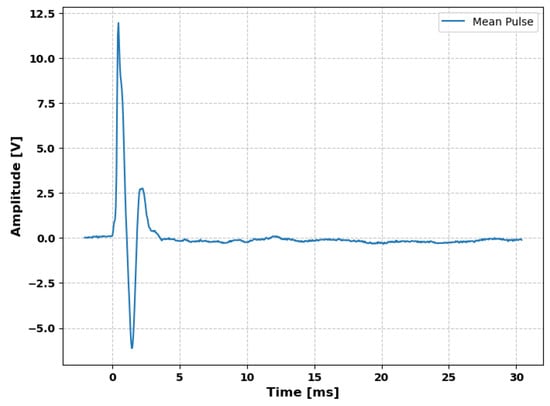 The electrical response of the insole under dynamic mechanical excitation was evaluated using the solenoid-based test rig operating at a frequency of four steps per second, which corresponds to a simulated running speed of approximately 20 km/h, assuming an average stride length of 1.4 m. Each actuation event applied a compressive force to the piezoelectret sensor zones, resulting in distinct voltage pulses characterized by sharp rise and fall transitions, consistent with the dynamic nature of heel–toe contact. To assess signal integrity and reliability over time, extended testing was performed for a total duration of 25 min, during which periodic waveform samples were recorded. Figure 16 shows the electrical response of a single pulse.