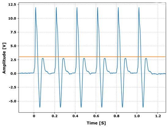 By applying this method to the mean value of the measured pulses, an RMS voltage of approximately 3 V was obtained. This value represents the effective energy contribution of each dynamic event over time, converting the alternating electrical behavior of the piezoelectret into a steady-state DC equivalent suitable for energy storage or powering low-power electronic devices. Figure 20 illustrates this relationship, showing the repetition of representative AC voltage pulses generated at 5 steps per second (blue waveform), overlaid with a constant orange line representing the calculated RMS voltage. This RMS line reflects the equivalent DC value that would deliver the same amount of energy over time, allowing a direct comparison between transient piezoelectric signals and their potential in real-world energy harvesting applications.