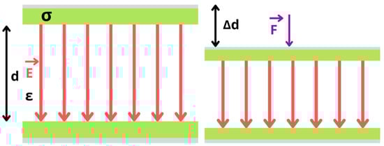 When the structure is mechanically compressed, the distance between the plates decreases by a small amount . Under the assumption that the internal electric field remains approximately constant during this small deformation, the resulting change in voltage across the electret can be approximated by the following:
