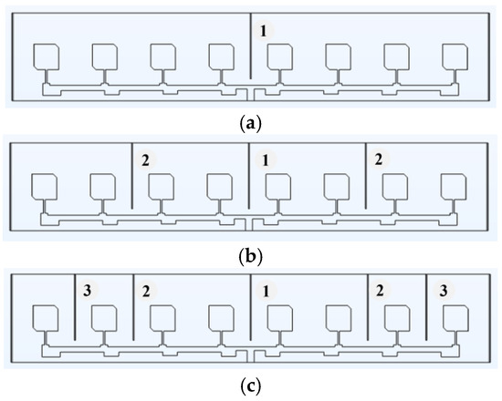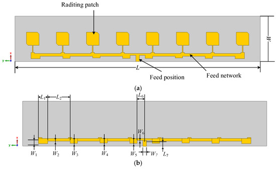 A Spaceborne microstrip antenna array is composed of eight of the aforementioned elements arranged in a linear configuration, as shown in Figure 2a. The overall sizes of the array are 48.44 mm × 8.92 mm × 0.32 mm. The structure of the feed network is illustrated in Figure 2b, with its sizes are presented in Table 3. The Chebyshev synthesis method [4] is used to determine the amplitude and phase of each antenna element, thereby achieving an optimal array radiation pattern. The excitation current amplitude ratio of the four antenna elements from the center to the edge in the feed network is calculated as follows: