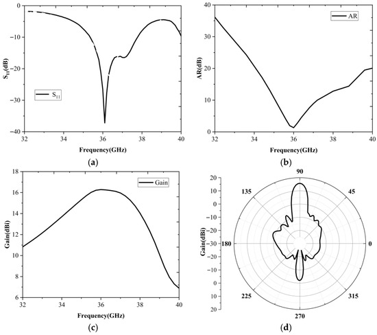 The COMSOL software is employed to simulate the electric performance of the spaceborne antenna array. The results are presented in Figure 3. As shown in Figure 3a, the reflection coefficient (S11) of the array is below −10 dB across the frequency band from 35.35 to 37.76 GHz. At the center frequency of 36 GHz, S11 reaches −26.57 dB. Figure 3b indicates that the axial ratio (AR) remains below 3 dB within the 35.69–36.19 GHz band. At 36 GHz, the AR is 1.54 dB, corresponding to an absolute AR bandwidth of 0.5 GHz and a relative AR bandwidth of 1.39%. Furthermore, Figure 3c,d show the variation of the gain with frequency and angle θ, respectively. A peak gain of 16.22 dBi is achieved. The radiation pattern in the φ = 90° plane exhibits a well-defined main lobe and side lobes, with a sidelobe level of −22.1 dB, which satisfies the design requirement of SLL < −15 dB.
