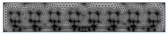 Multi-physics field analysis of the microstrip antenna array is performed by the COMSOL under both high and low temperature conditions. The unstructured finite element mesh is shown in Figure 5. The maximum and minimum element sizes are set to 5.26 mm and 0.947 mm, respectively.