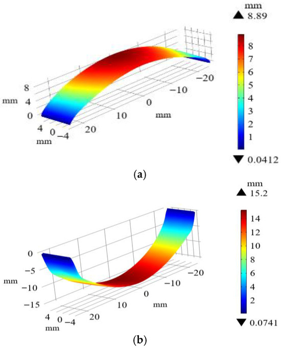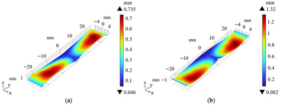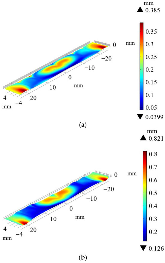 Figure 7 shows the steady-state strain distribution of the array under high and low temperature conditions. As observed in Figure 7a, the overall structure of the array deforms into an upward convex shape. The maximum deformation is 8.89 mm occurs at the center of the array, decreasing toward both ends, where the minimum deformation is 0.04 mm. At an ambient temperature of 120 °C, the array undergoes thermal expands. Since the thermal expansion coefficient of the dielectric substrate is greater than that of the copper ground plate, the upper dielectric substrate expands more significantly than the lower ground plate. As the ground plate constrains downward expansion of the substrate, the array deforms into an upward convex shape.