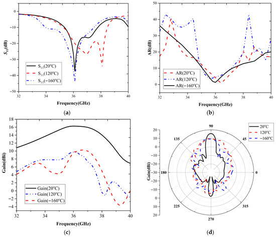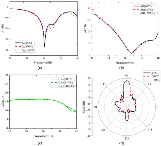 Electrical performance parameters of the optimized array in different temperatures: (a) S11; (b) AR; (c) Gain; (d) Radiation patterns at φ = 90°.