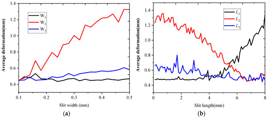 The positions of the slits are determined, and the next step is to optimize each slit size of the array. Figure 11 illustrates how the average deformation of the array varies with the width and length of the slits. As seen in Figure 11a, the average deformation increases with the width of Slit 2, while it shows negligible variation with the widths of Slit 1 and Slit 3. Therefore, the slit width should be made as small as possible to minimize thermal deformation under extreme temperatures. However, the precision of the manufacturing process can only reach 0.1 mm; thus, all slit widths have to be set to a width of 0.1 mm. Since the slits are etched on the copper ground plate, the depths of the slits are 0.035 mm, equal to the thickness of the copper layer. In addition, Figure 11b indicates that the average deformation increases with the length of Slit 1, decreases with the length of Slit 2, and remains largely unaffected by the length of Slit 3.