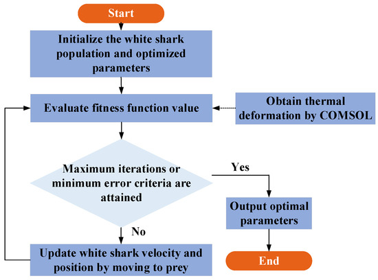 The WSO algorithm is used to optimize the lengths of the slits. The optimization process is outlined in the flowchart shown in Figure 12. The specific steps are as follows: (1) Initialize the population of white sharks and slit lengths; (2) Use MATLAB R2023a (Manufactured by Mathworks, Natick, MA, USA) to call COMSOL to simulate the array, thus obtaining the deformations. Calculate the fitness function value, defined as the average deformation of the array; (3) Check if the termination iteration condition is satisfied. If yes, output the optimal solution directly; If not, update the velocity and position of the white shark and return to Step 2. In addition, for the WSO algorithm, the population size and the maximum number of iterations are set to 15 and 30, respectively. When the maximum number of iterations is reached, return the best solution obtained so far.