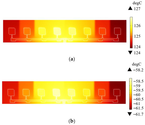 The steady-state temperature distributions are shown in Figure 6. It can be seen that the temperature distribution characteristics: (1) The distribution is symmetrical, decreasing from the center towards both sides—a pattern analogous to the electric field distribution observed earlier. (2) Under a high-temperature ambient condition of 120 °C, the maximum array temperature reaches 126 °C, while in a low-temperature environment of −160 °C, it attains −57.57 °C This behavior results from internal electromagnetic power dissipation within the array. (3) The radiating patch exhibits a slightly higher temperature than the dielectric substrate, due to its significantly higher thermal conductivity (400 compared to 0.2 for the substrate).