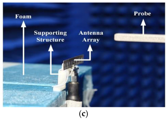 A vector network analyzer is employed to measure the S-parameters of the antenna array in its steady state. As shown in Figure 17a, the simulated and measured results are in good agreement. A near-field testing system is used to capture the near-field distribution, and the far-field radiation characteristics are subsequently derived through near-field and far-field transformations. The measured AR, gain, and radiation patterns are shown in Figure 17b,c,d, respectively. While the measured trends align with the simulations, certain deviations are observed. This can be attributed to the following factors: (1) deviations between the actual measurement environment and idealized simulation conditions; (2) limitations inherent to the measurement techniques; and (3) imperfections introduced during the manufacturing processes.
