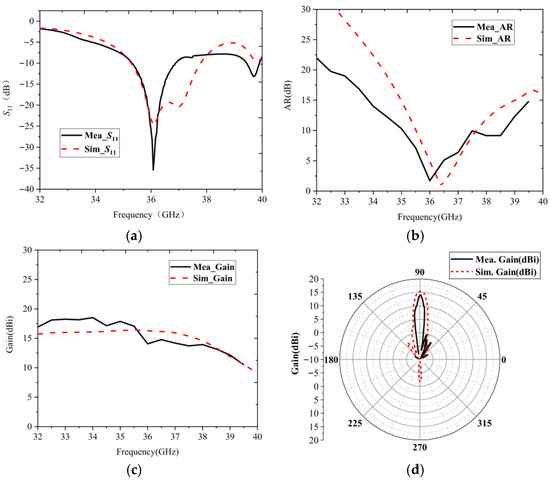 Measurement and simulation results of the real array: (a) S11; (b) AR; (c) Gain; (d) Patterns at φ = 90°.