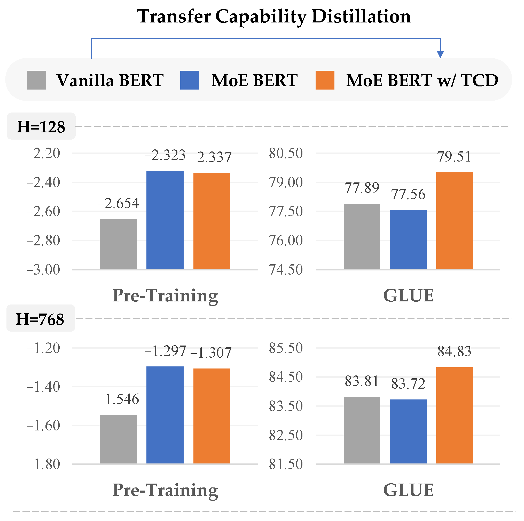 From these results, it is clear that for both model sizes, the general pre-trained MoE-BERT and the MoE-BERT with transfer capability distillation achieved closely aligned pre-training performance. The new models demonstrated significant improvements across all downstream tasks, confirming that our method effectively enhanced the transfer capability of MoE-BERT. Notably, the MoE-BERT with transfer capability distillation outperformed its teacher model in both pre-training and downstream performance, demonstrating the effectiveness of transfer capability distillation and validating our proposition that vanilla Transformers serve as effective transfer capability teachers.