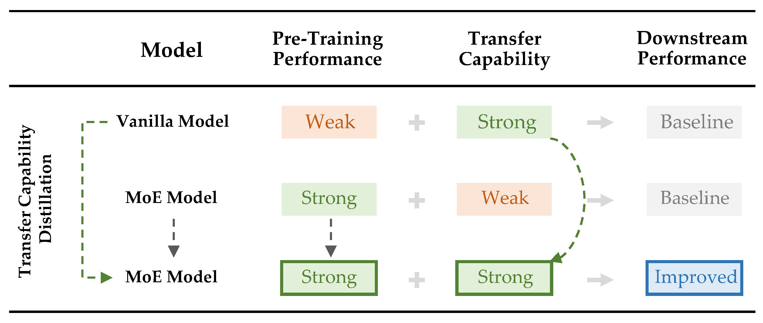 Based on the above explanation, we propose a solution to this issue—since the transfer capability of vanilla models is strong, it may be possible to transfer this capability to MoE models through distillation. We call this idea transfer capability distillation (TCD). The underlying logic is that although the pre-training and downstream performance of vanilla models are relatively weak, their transfer capability is stronger. By using them as teachers, we can enhance the transfer capability of MoE models. Combined with the strong pre-training performance of MoE models, this approach could lead to a comprehensive improvement in MoE models, as depicted in