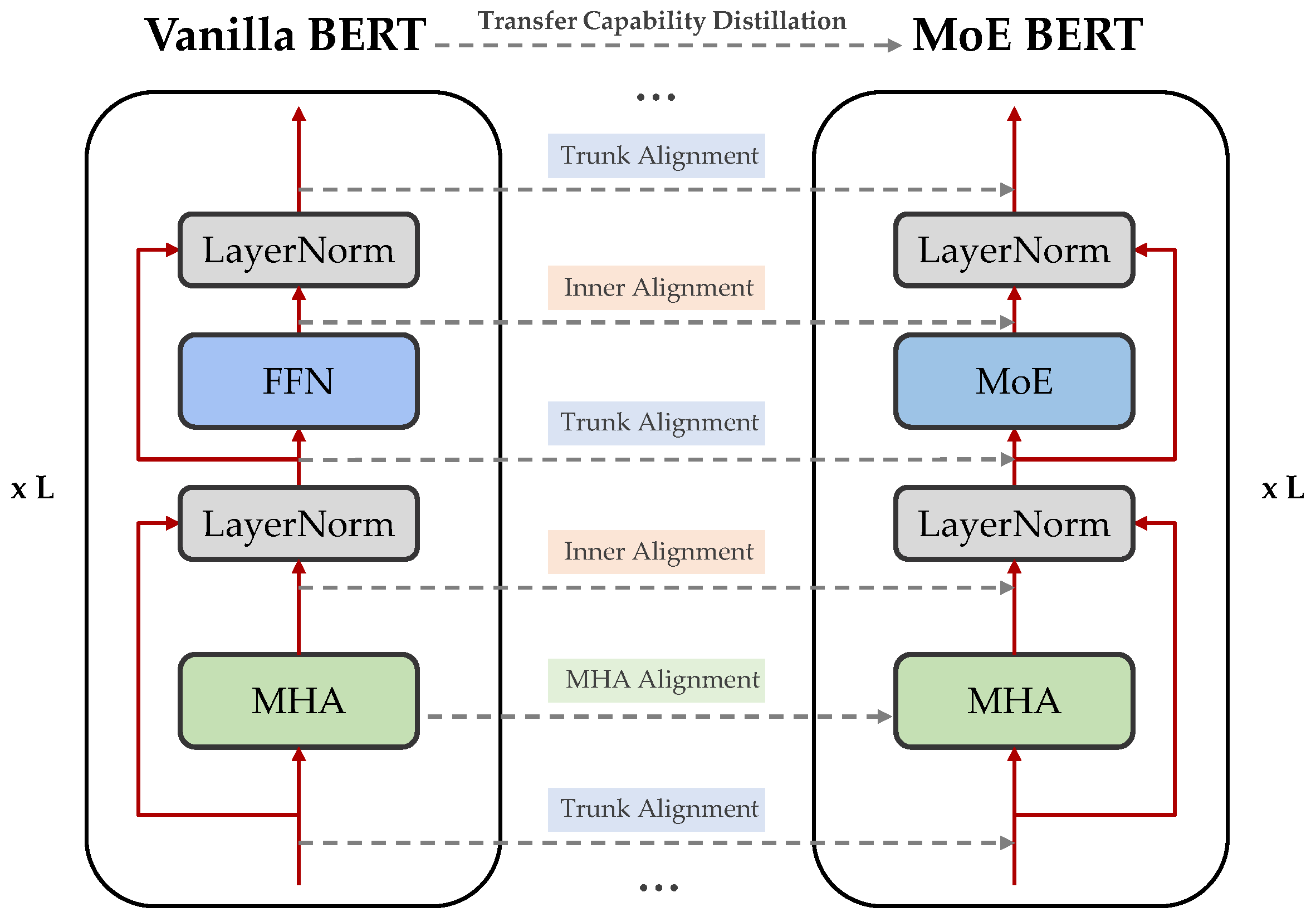 In the following sections, we will first introduce the vanilla BERT model as the teacher model and the MoE-BERT as the student model. Subsequently, we introduce the specific implementation of transfer capability distillation and conclude with an overview of the training process.