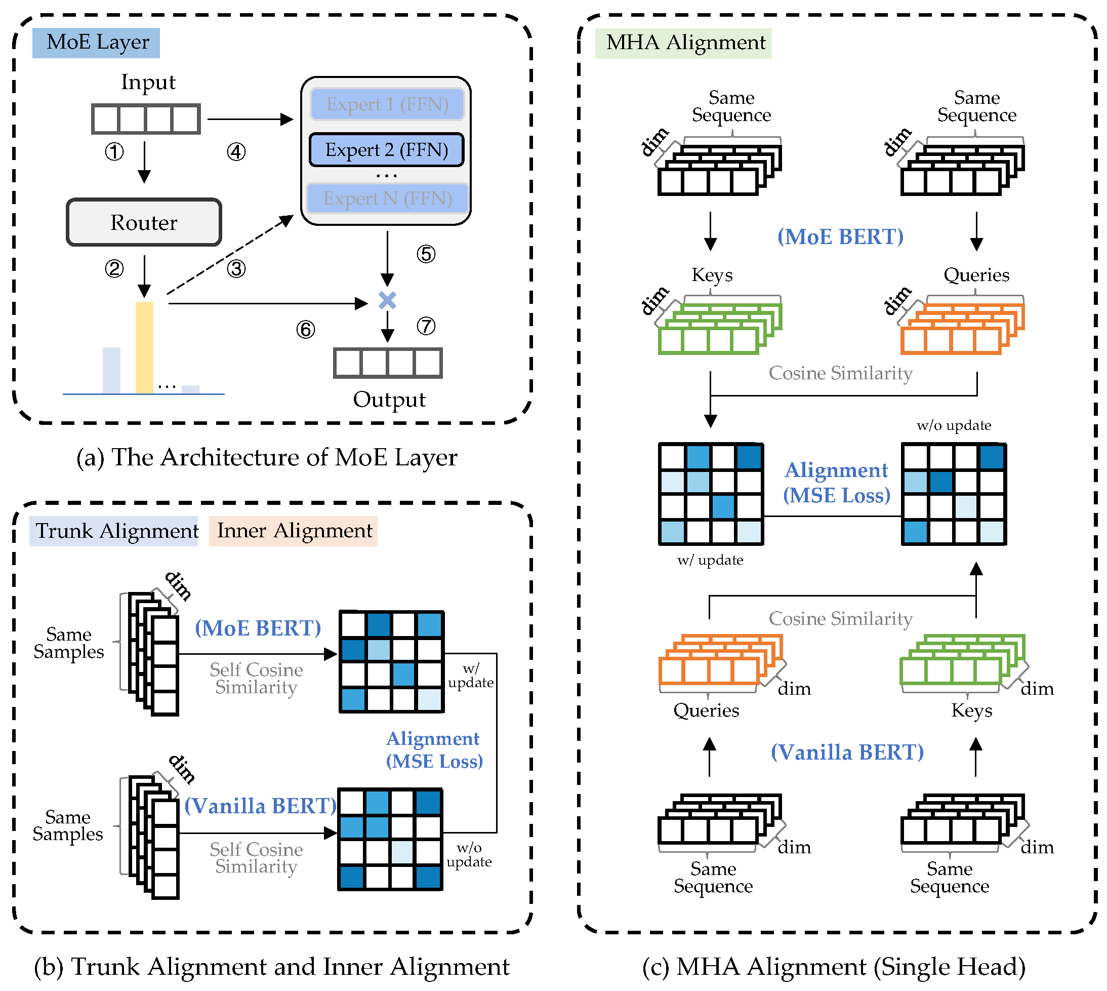 Specifically, we select three locations in the vanilla BERT models and MoE-BERT models for relation alignment, as shown in