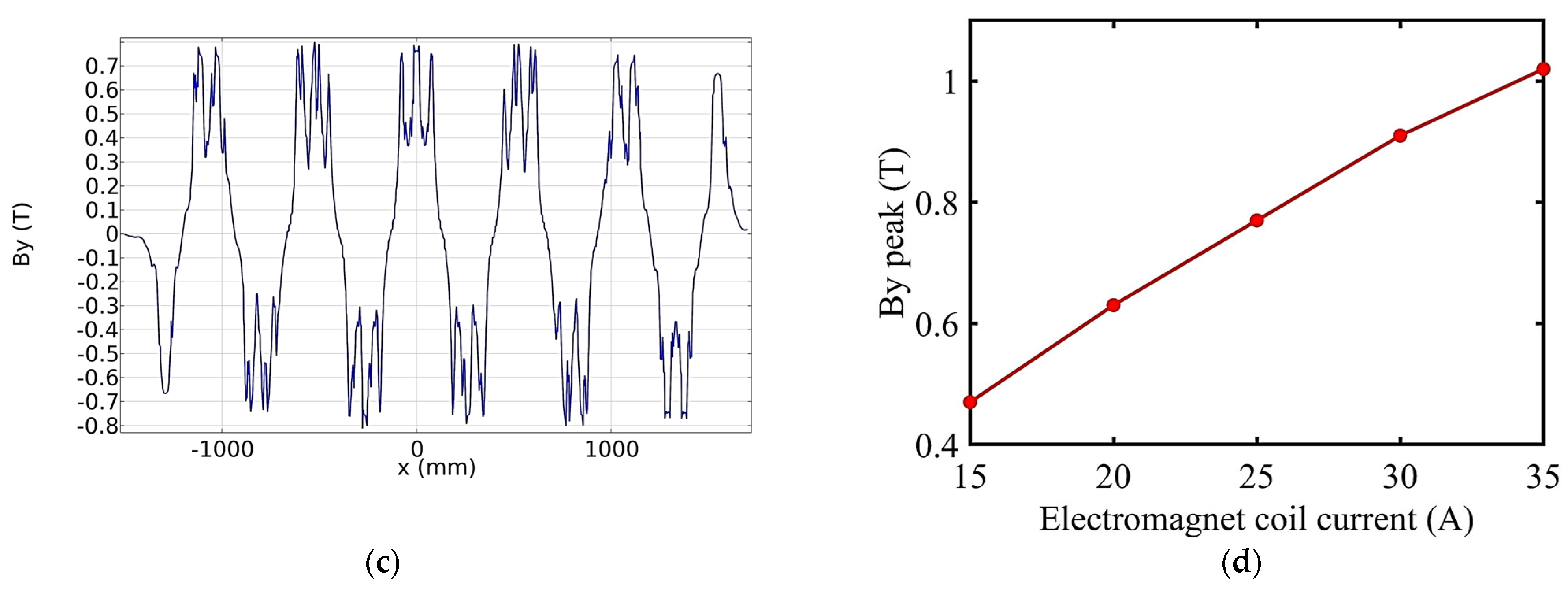 y-axis component of flux density in the air gap rose from 0.47 T to 1.02 T when the electromagnet coil current increased from 15 A to 35 A. When the current reached approximately 35 A, the increasing rate of the magnetic field decreased (