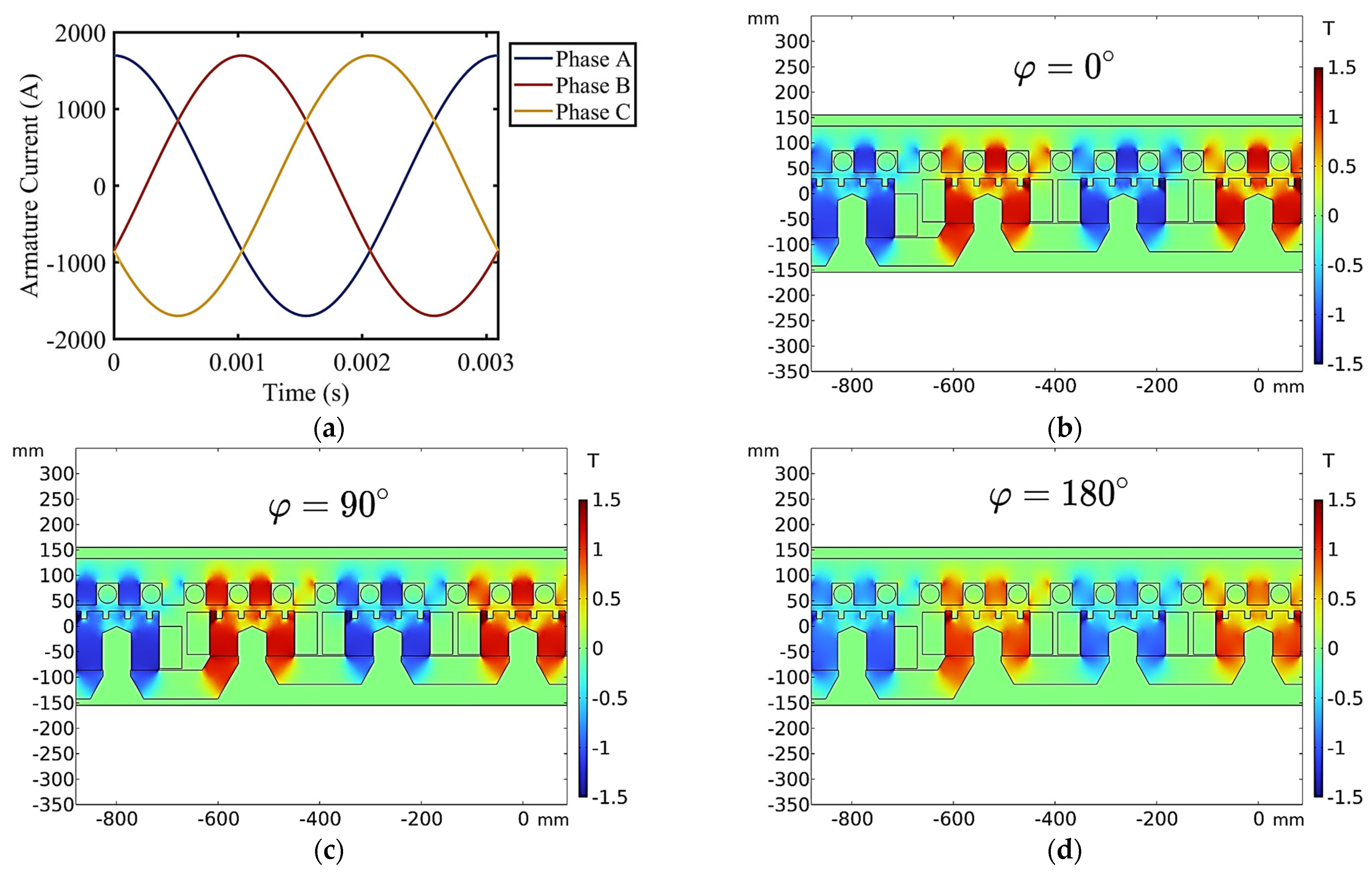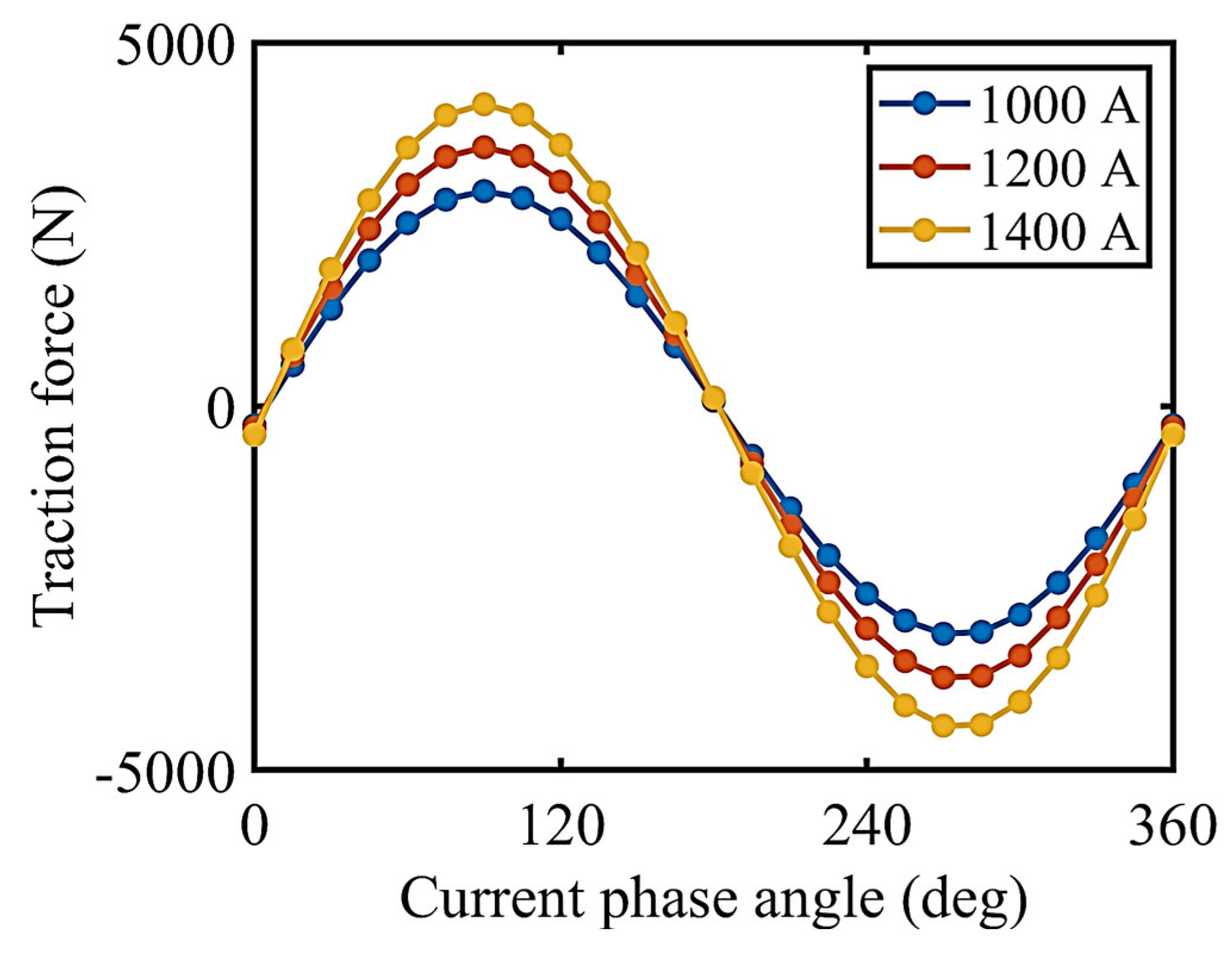 When the current phase angle was 90 degrees and the armature current was 1200 A (r.m.s.), the traction force reached a positive maximum of 3563 N for a single electromagnet module, and when the current phase angle was 270 degrees, the traction force reached a negative maximum −3727 N, as shown in