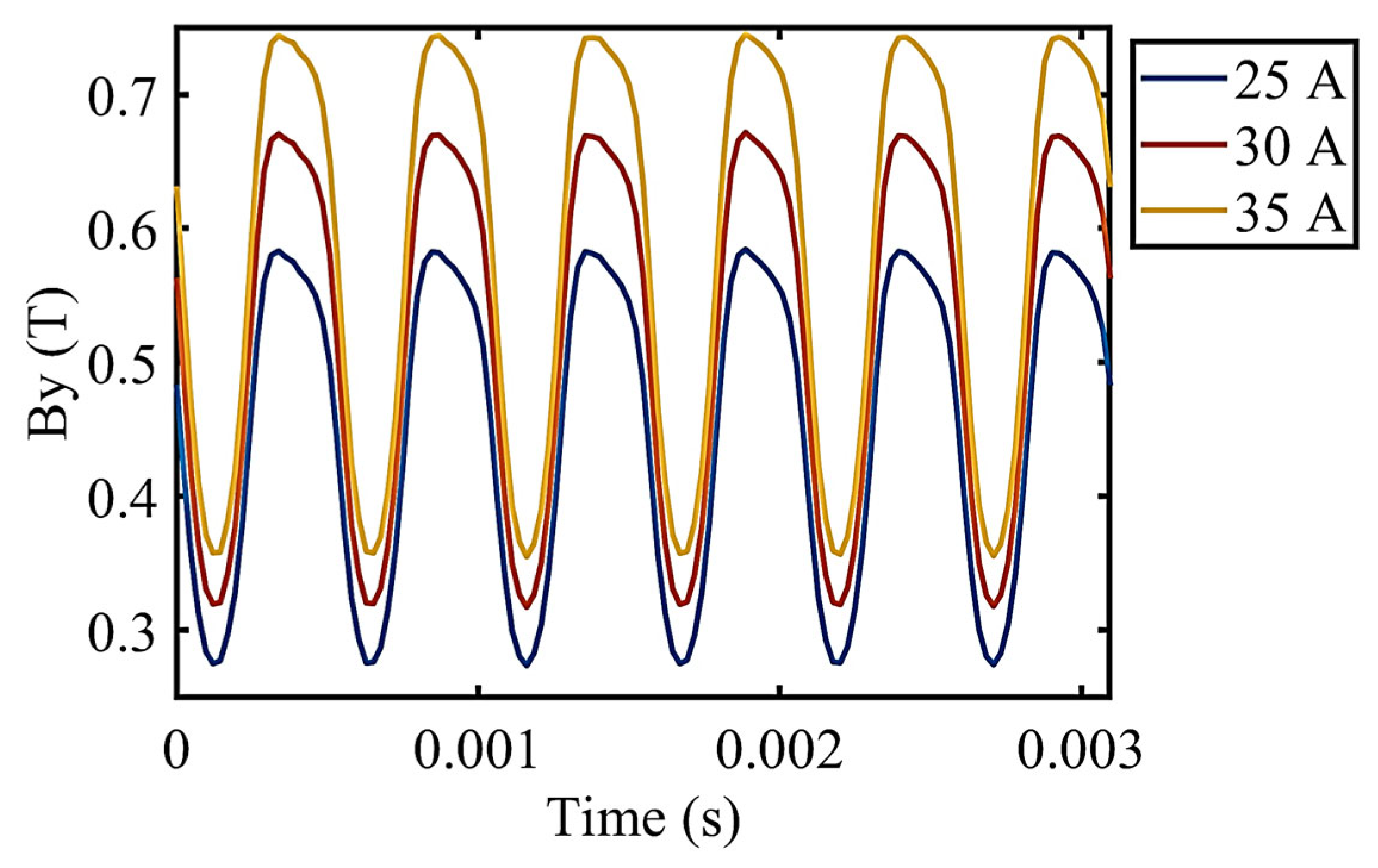 Figure 7, if the electromagnet coil current was 25 A, the flux density fluctuated between 0.28 T and 0.58 T; if the electromagnet coil current was 35 A, the flux density fluctuated between 0.37 T and 0.74 T. These flux density harmonics can excite the linear generator to generate electricity. A more detailed harmonic analysis is provided later.