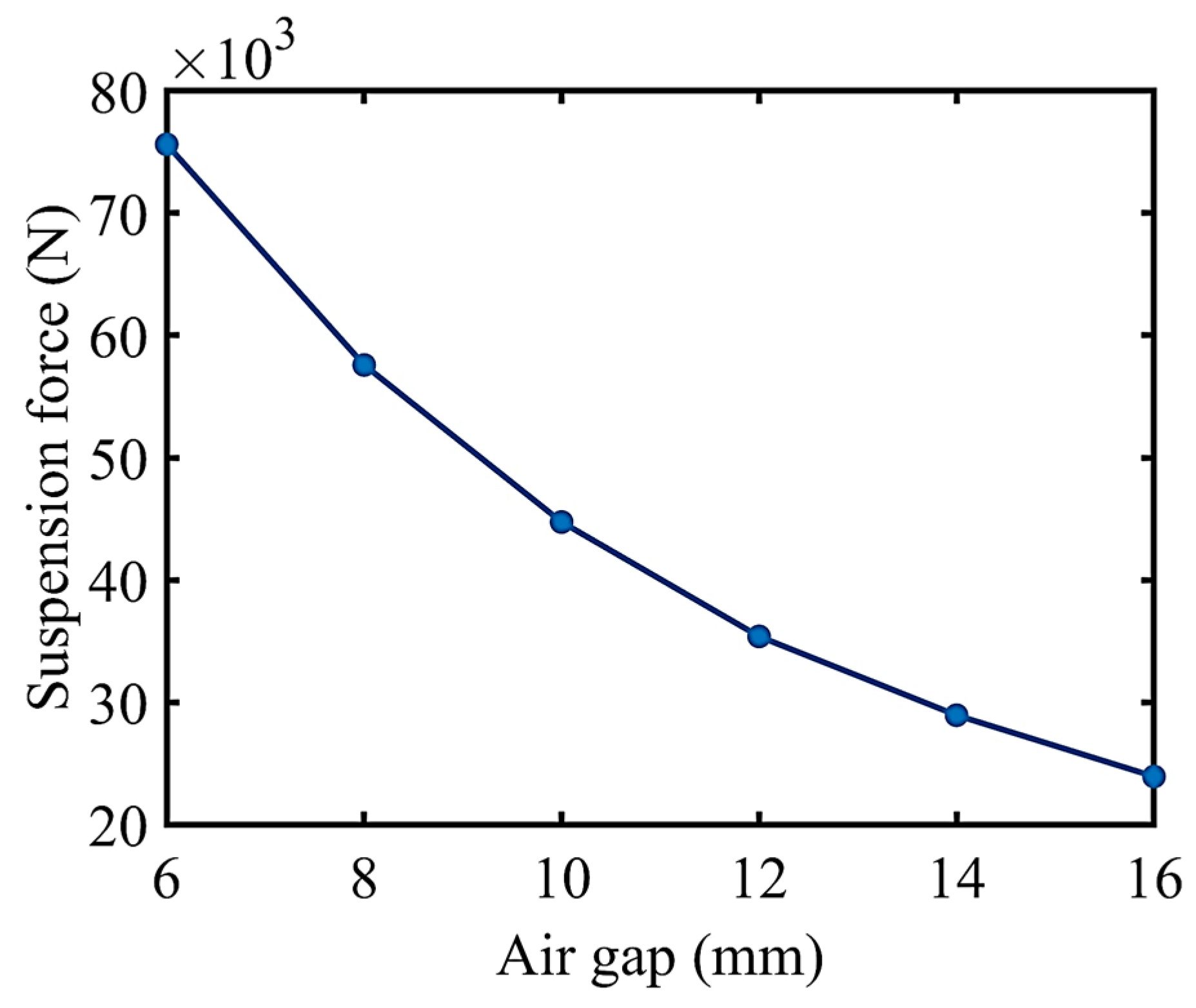 Maglevs rely on synchronous linear motors for propulsion, with key performance metrics such as suspension force and traction force constituting core indicators of the maglev system. The influence of certain electromagnetic parameters on the suspension force and traction force is examined in this section. Firstly, the impact of the air gap on maglev performance is analyzed. For EMS-type maglev systems, the operational air gap typically ranges between 8 and 10 mm. FEM analysis revealed the relationship between suspension force and current within the electromagnet module when the electromagnet current was 25 A.
