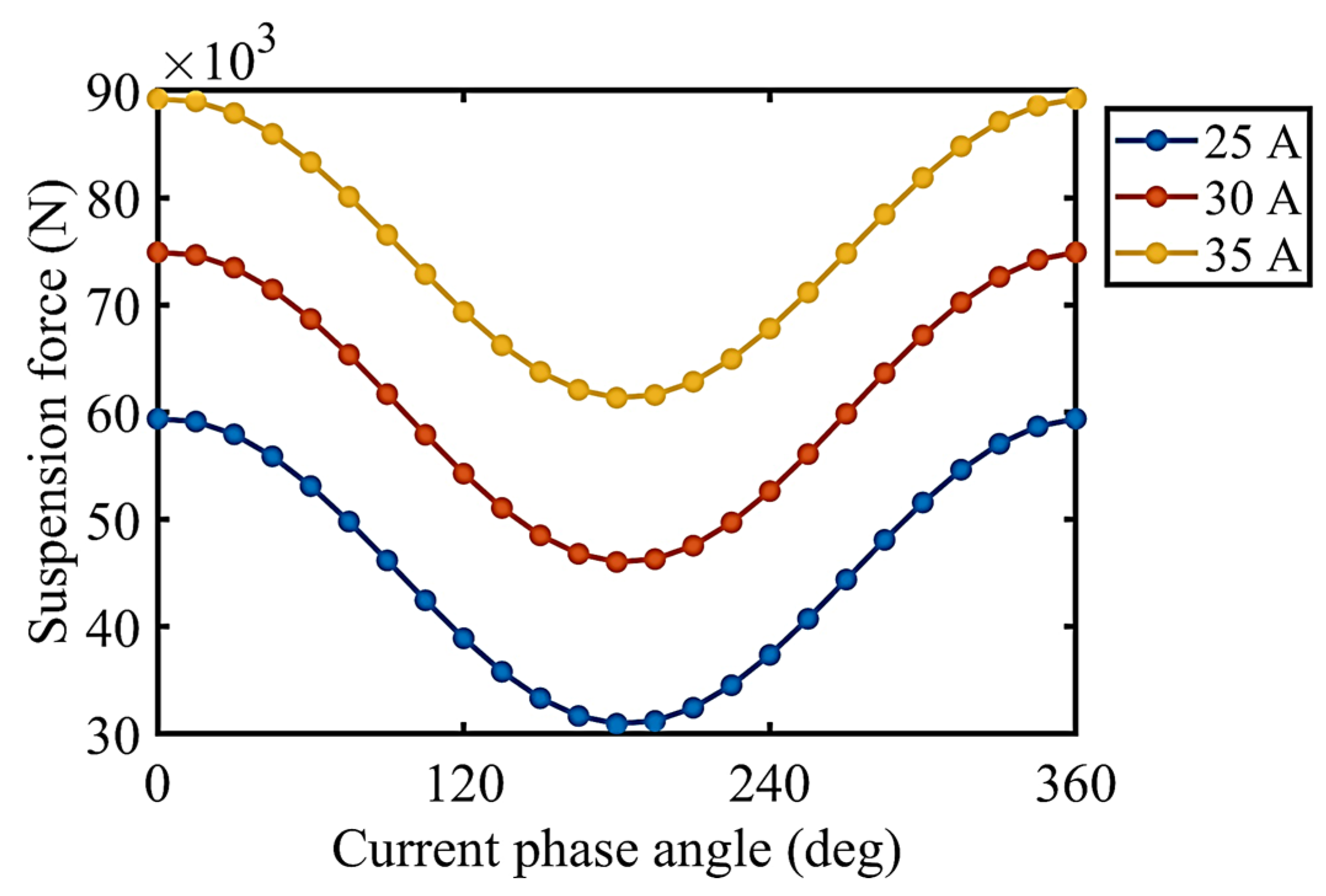 Figure 10. When the current phase angle was 0 and 180 degrees, the suspension force reached its maximum (59.4 kN) and minimum (31.0 kN), respectively, if the electromagnet coil current was 25 A. The suspension force increased to 61.4–89.2 kN if the electromagnet coil current increased to 35 A. The suspension force is positively correlated with electromagnet coil current. The maglev was in stationary condition.