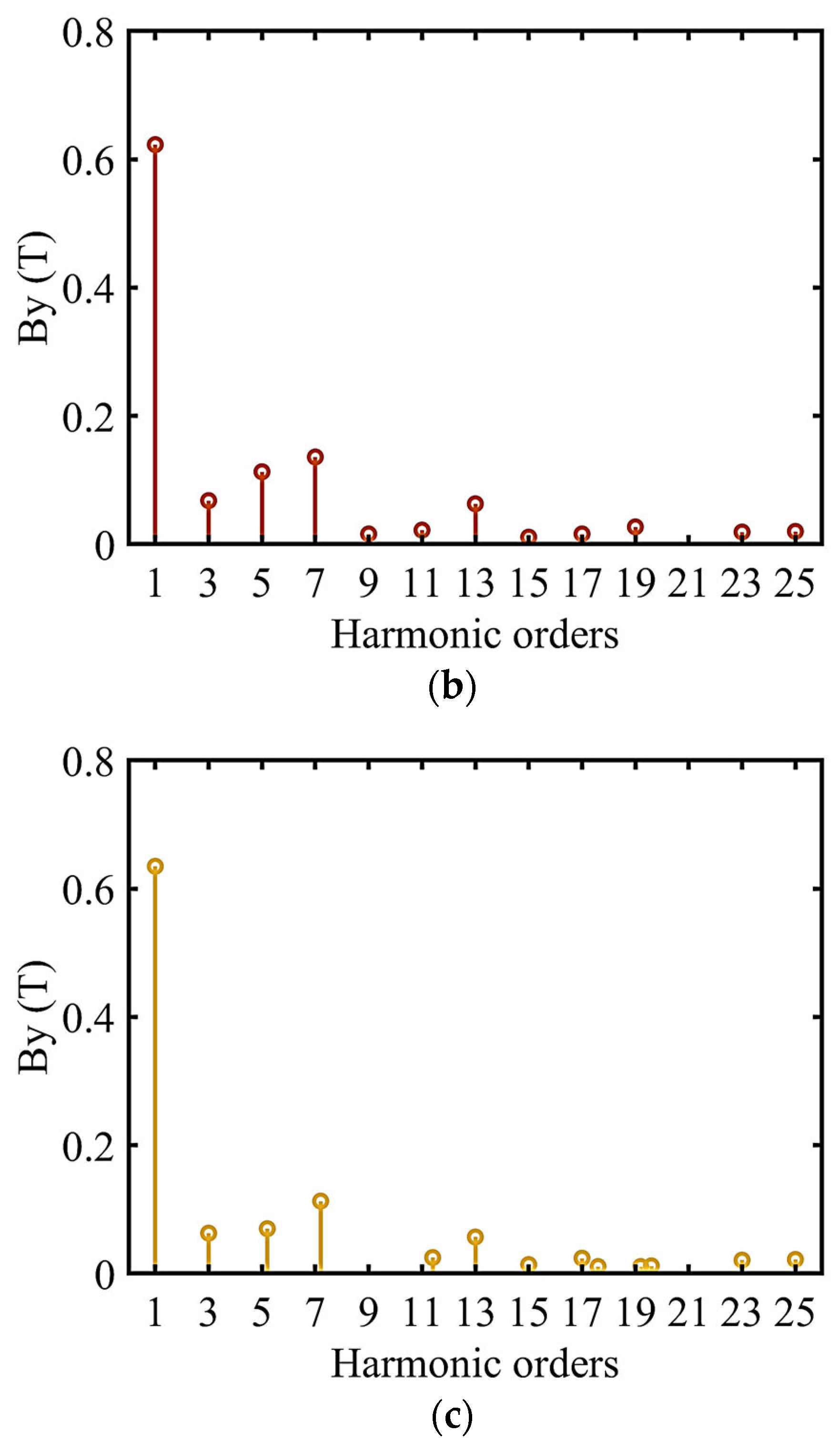 Figure 11), it can be seen that the harmonic components generated in the three situations are mostly odd orders. The harmonic components of the stator with integer slots were slightly more than those without slots. The fifth and seventh harmonics were relatively high because the pole pitch of the moving stator was six times the slot pitch of the stator. When the stator was in fractional slots, fractional harmonics of 5.2 times and 7.2 times the fundamental frequency occurred. This was caused by the fact that the pole pitch of the moving stator is approximately 6.2 times the slot pitch of the stator.