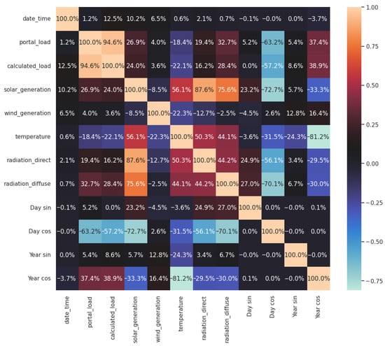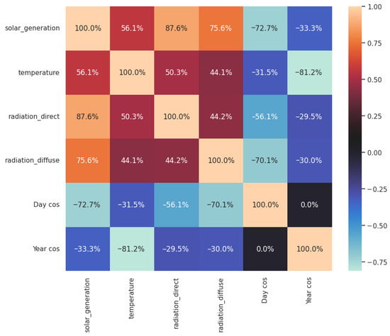 was computed between all pairs of variables in order to determine which variables are highly positive or negatively correlated with the independent variable (i.e., “solar generation”) and between them. The correlation matrix is visualized in Figure 1. Variables highly correlated with the independent variable are the most informative, so they will be selected as inputs for the model. Variables with low correlation and non-significant p-value () with the target variable (i.e., “date_time”, “wind_generation”, “Day_sin”, “Year_sin”) were removed. Variables exhibiting high multicollinearity (i.e., “portal_load”, “calculated_load”) were also removed. Removing uncorrelated variables is a common practice in feature engineering in order to reduce model complexity and to improve the efficiency of the learning process [57].
