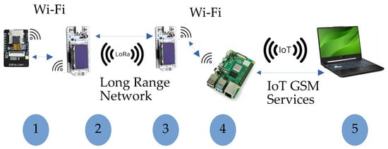 Base components of photo trap ecosystem. 1—camera; 2,3—microcontroller with long-range RF network modem; 4—IoT GSM gateway; 5—user interface; WiFi—local short-range network.