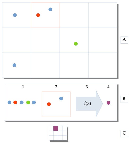 Monte Carlo image sampling, data transfer, and block-based image reconstruction. (A)—original image with chosen pixels; (B) (1)—data stream from chosen pixels; (B) (2)—reconstruction placement in defined block; (B) (3)—reconstruction pixel formula; (B) (4)—new pixel after reconstruction; (C)—reconstructed image with calculated pixel in position determined by block from original image.