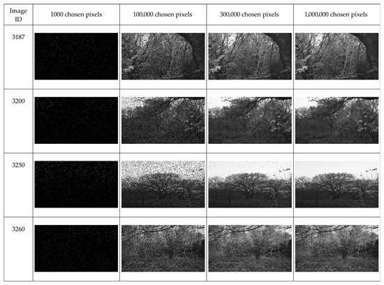 Figure 4 presents four example image reconstructions (rows) obtained with varying numbers of analyzed samples (columns). For 1000 samples, individual reconstructed pixels are visible against the original background, which appears as an artifact resulting from the initialization (zeroing) of the reconstruction array. In subsequent iterations, the images exhibit progressively improved quality, with a decreasing number of artifacts caused by blocks lacking pixel information. These artifacts can either be filtered out or allowed to disappear naturally as more samples are acquired, assuming the sampling process is continuous and the number of samples increases over time.
