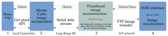 Information flow in photo trap ecosystem: 1—image source; 2—Monte Carlo sampling and data stream sender; 3—data stream receiver for image reconstruction and FTP client; 4—FTP server and application interface; PUSH image—decision process for sending thumbnail or reconstructed image.